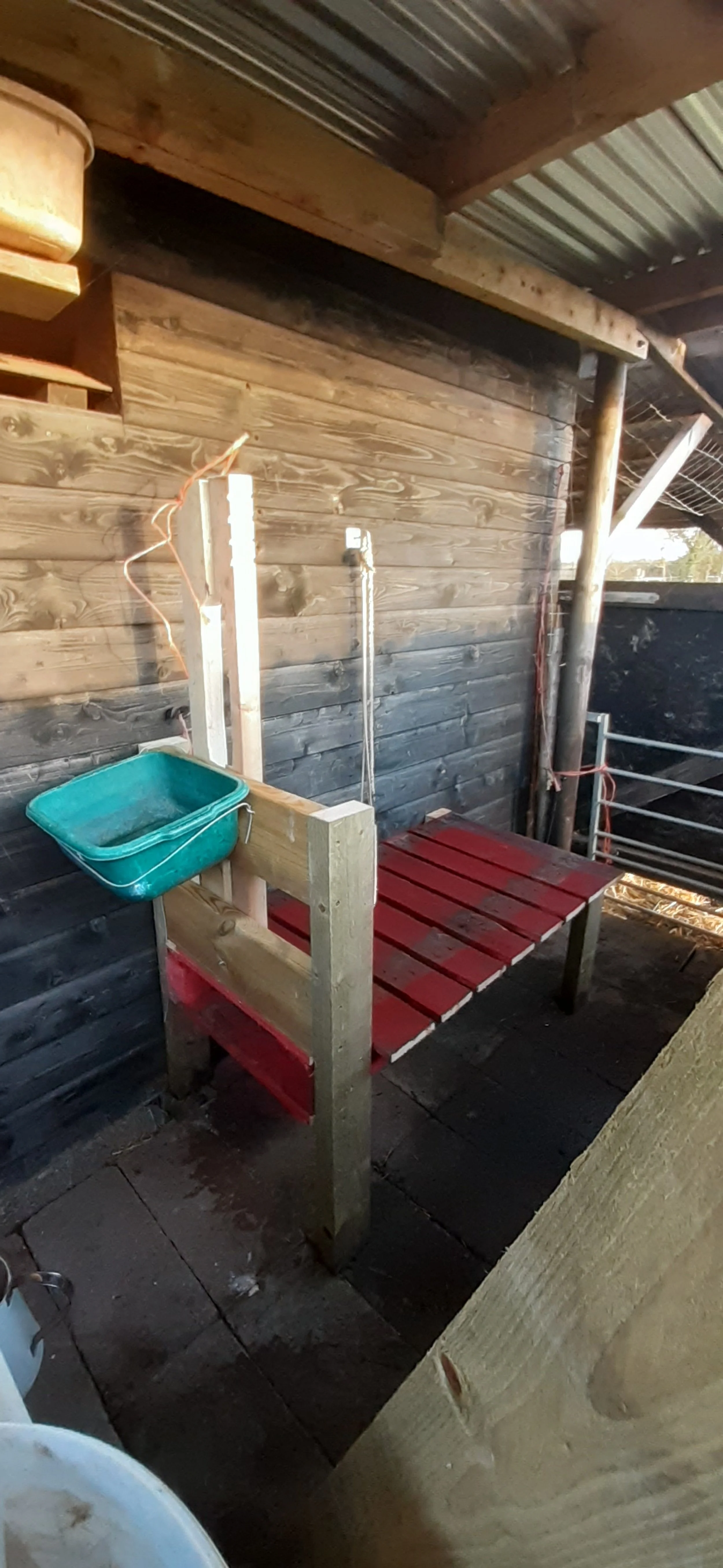 05 Using fencing rail, fit four legs (height is personal choice). The side towards the camera is slightly overhanging the rear leg so the milker can sit comfortably when milking.